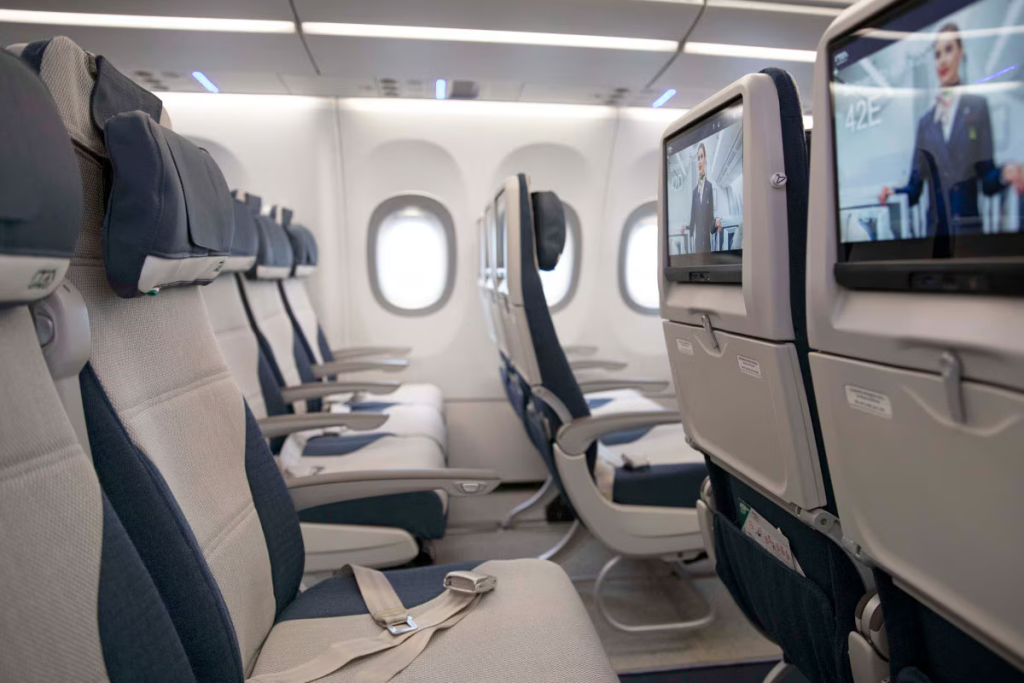 The cabin on ITA Airways’ long haul aircraft is stunning. The airline chose for a sleek creme and navy design. Granted, the creme colored seats get stained very easily, but I fortunately could not spot any stains yet. The A350 on ITA features a 3-3-3 configuration. On my seat, a blanket and a pillow were awaiting me. What I loved (and I bet I was one of the few people to notice this) is that the amenities onboard, like this blanket and pillow, still carry the Alitalia branding. Feels like a throwback and I appreciate it. Furthermore, the entertainment screen is big and seat pitch plenty. I am 1,83m and I did not feel uncomfortable for a single second.